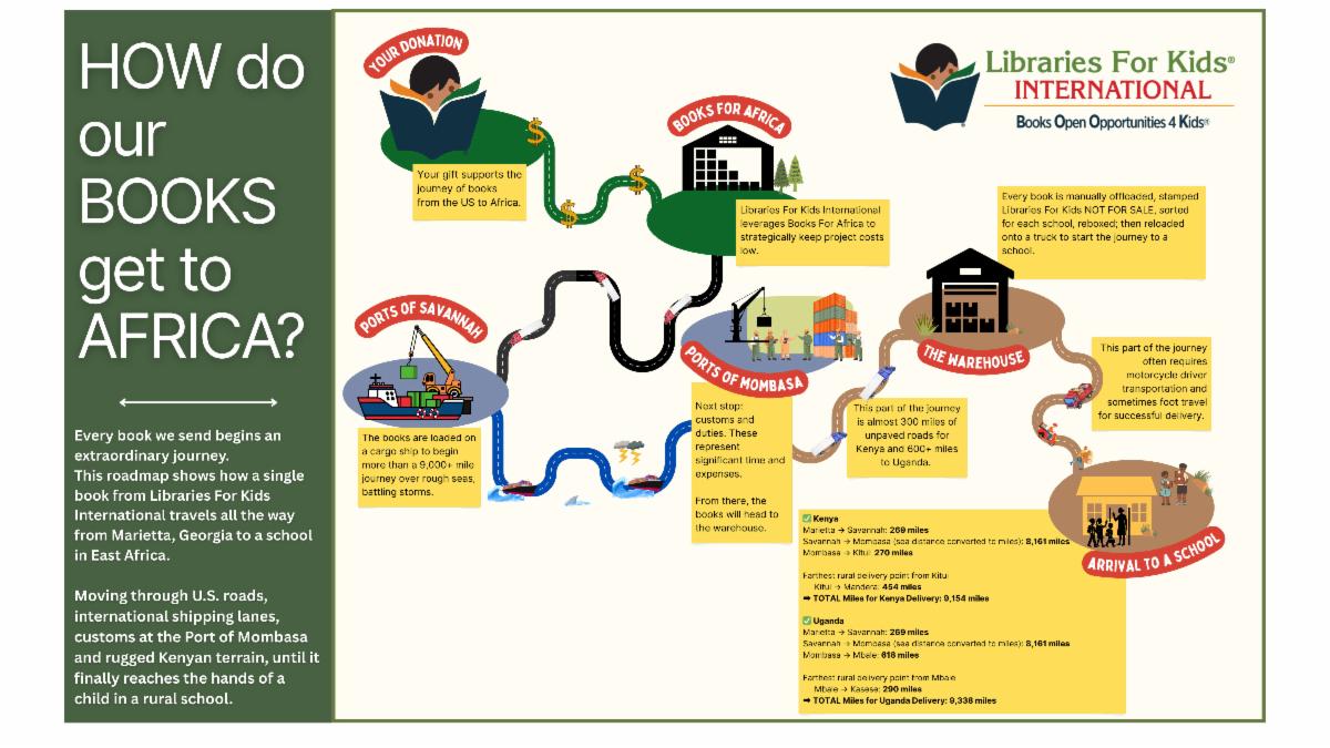 shipment of 297,000 books in five shipping containers sent to Kenya by Libraries for Kids International beginning in August 2025. The containers arrived in October 2025. A shipment of 297,000 books in five shipping containers sent to Kenya by Libraries for Kids International beginning in August 2025. The containers arrived in October 2025.