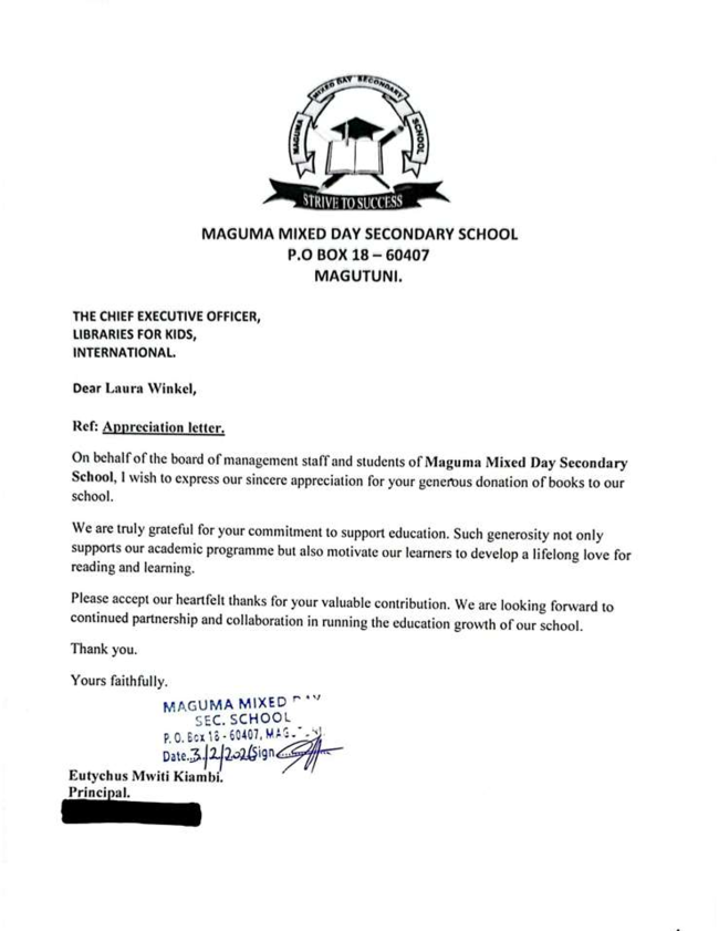 "We are truly grateful for your commitment to support education," Kiambi's letter said. "Such generosity not only supports our academic programme but also motivate(s) our learners to develop a lifelong love for reading and learning." The principal added that the school's staff and students "look forward to continued partnership and collaboration in running the education growth of our school."